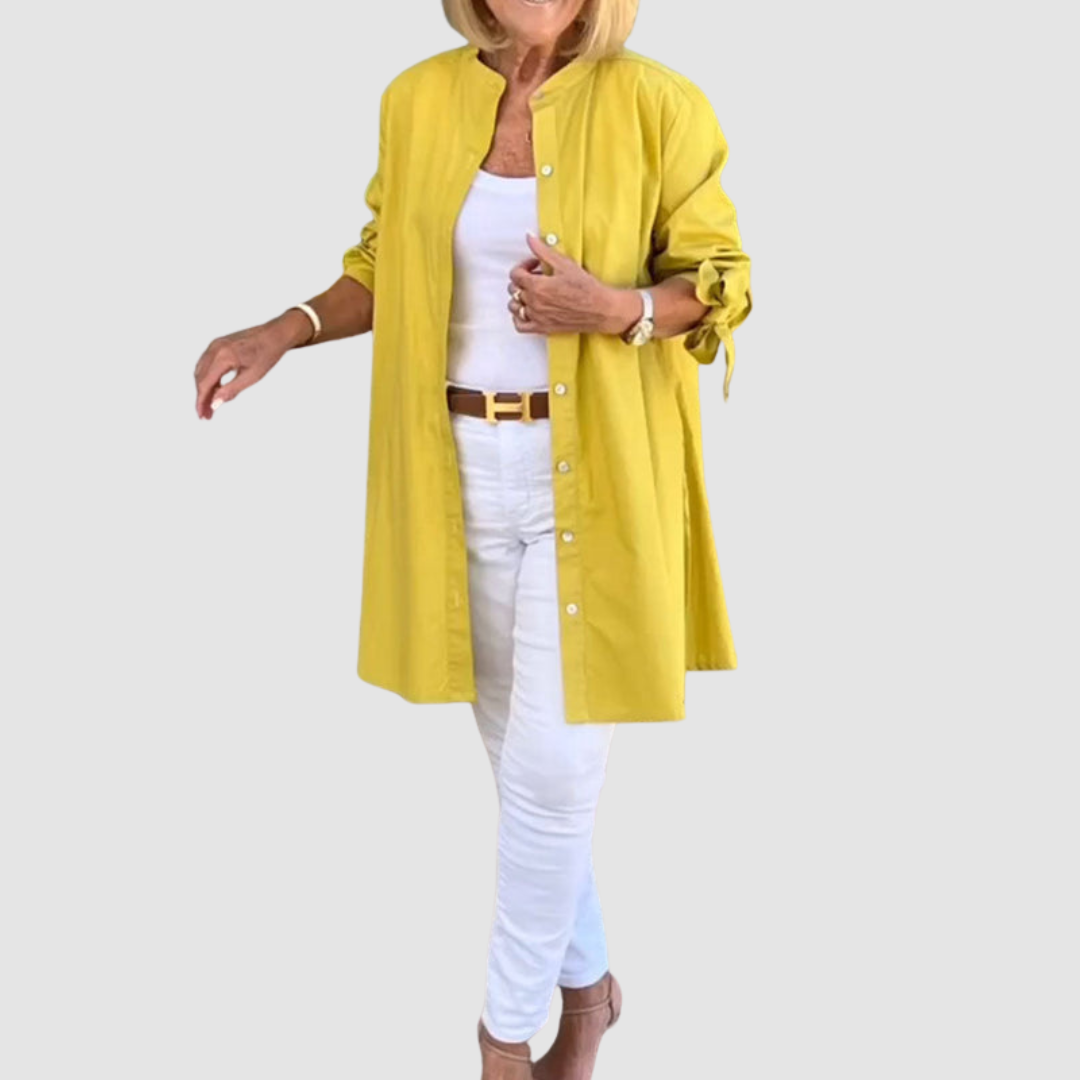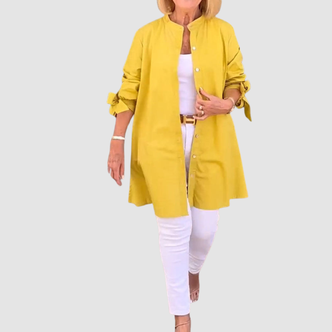 • Modern Mandarin Collar: The stand-up collar gives a structured and elegant touch to a relaxed everyday look.